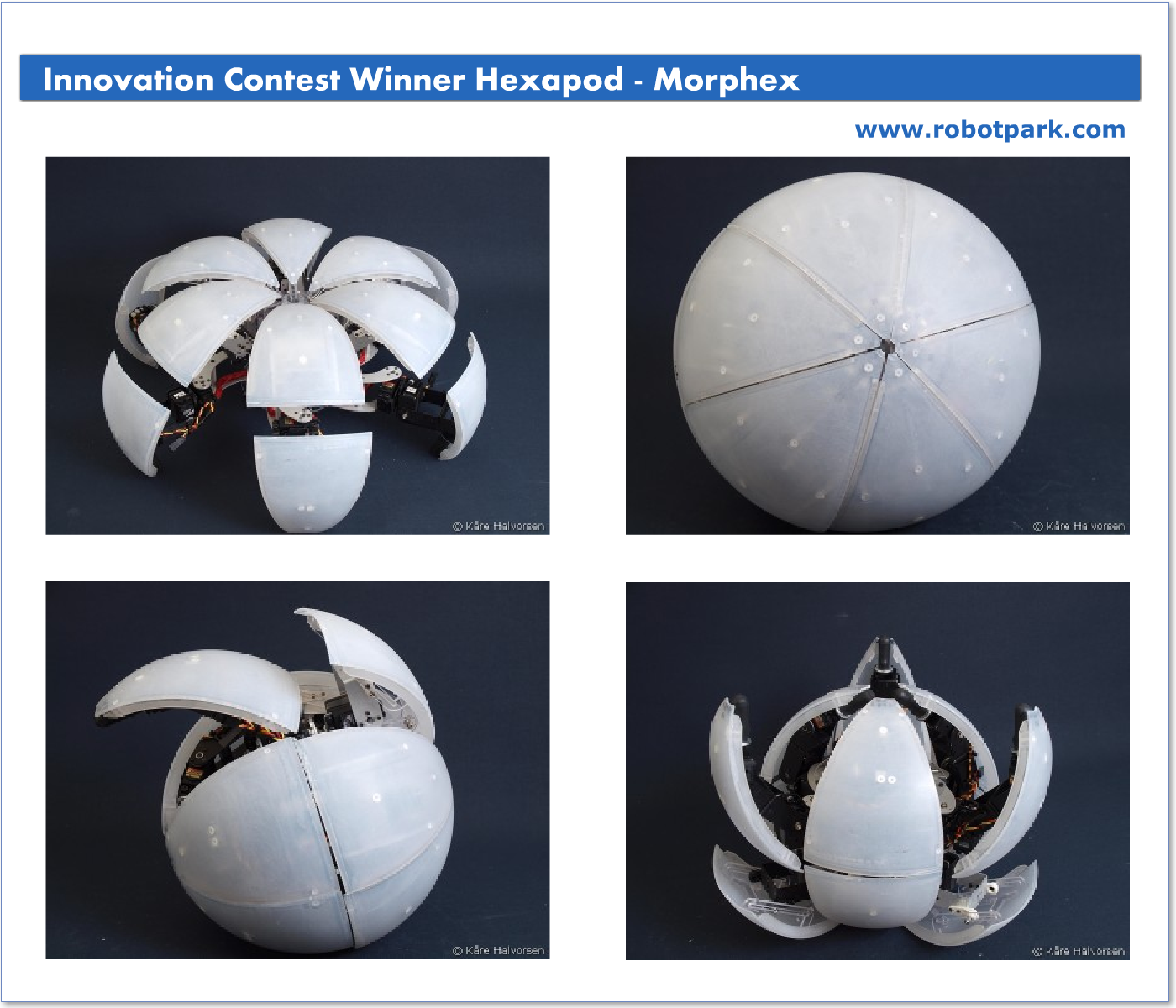 10,000$’lık büyük ödülün kazananı Norveçli Kare Halvorsen‘in Morphex III tasarımı oldu. Kare oldukça etkileyici bir hexapod robot platformu tasarladı. Morphex III ayakları üzerinde yürüyebiliyor ve hatta isterse bir küre şeklini alıp top gibi yuvarlanabiliyor. Robotun gövdesinde bulunan 36 adet bilyalı rulman ve 12 adet rulman tek parça halinde kalmasını sağlıyor. Kare MorpHex III’ü tasarlarkenki motivasyonunu şöyle açıklıyor.