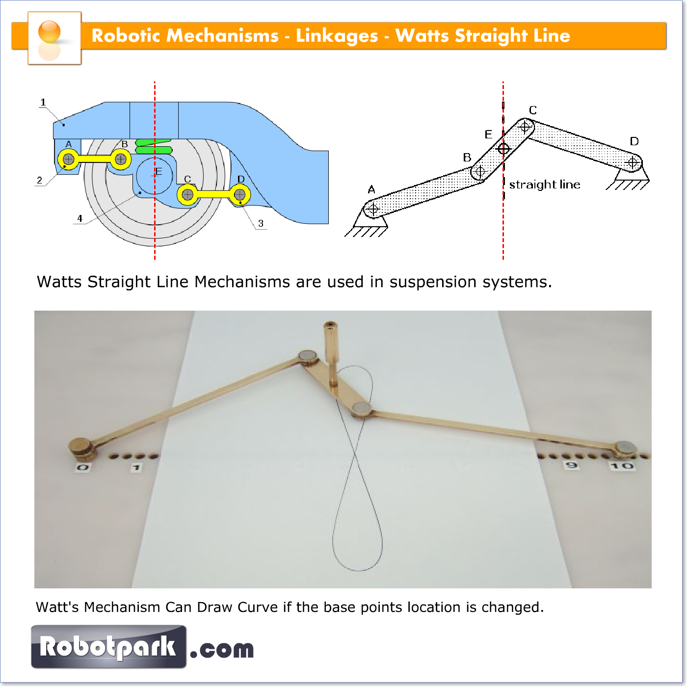 Watt’ın düz çizgi mekanizması kısa düşey bir düz doğru gösterebilir. Eşit uzunluklar AB ve CD, sırasıyla A ve D noktalarından menteşelenmiştir. Bağlayıcı parça BC’nin orta noktası E, bütün mekanizmanın yolculuğu sırasında 8’e benzer bir şekil çizer. Ancak yolculuğun bir kısmında düzgün bir çizgi oluşur çünkü E noktası hareketin tepesinde sola, dipinde ise sağa ıraksar. Bu bağlantı İskoç enstrüman üreticisi James Watt tarafından yaklaşık 1769 yılında ilk buharlı pompada kullanılmıştır. Bu mekanizma erken buharlı makinelerde öne çıkmıştır.